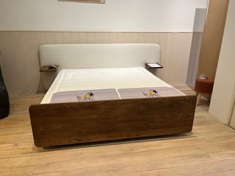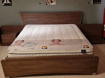 Cadre de lit en bois, 2 tables de chevets assorties.